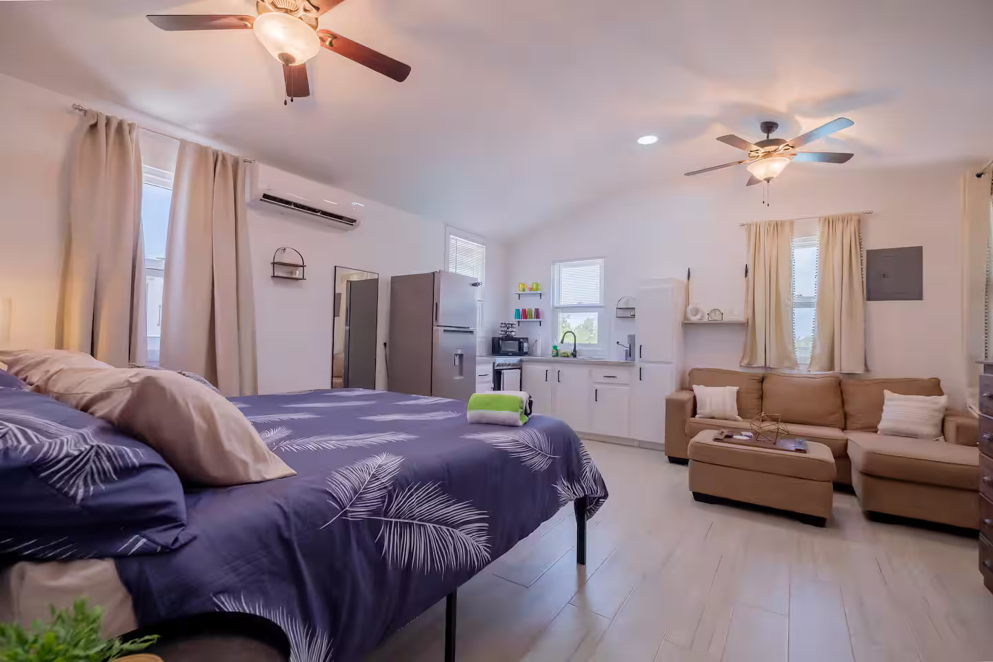 Modern Comfort: This studio is fully equipped with a kitchen, a comfy sofa, a Smart TV, and a powerful AC unit to keep you cool after a day in the sun.